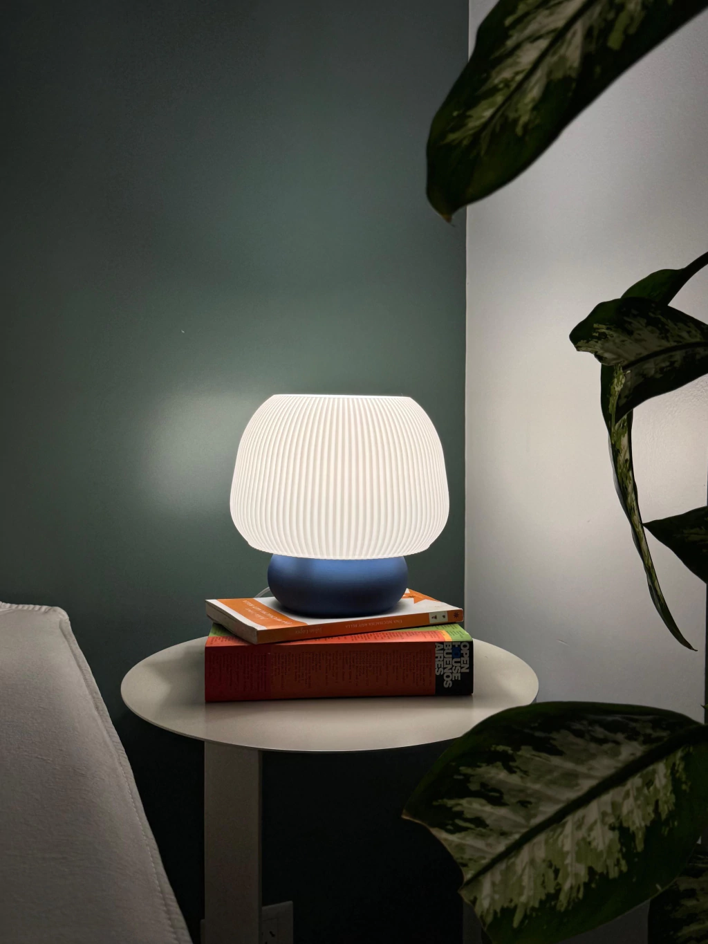 La lámpara Mushroom combina líneas suaves con una estética orgánica inspirada en las formas de la naturaleza. Su estructura impresa en PLA genera un cuerpo sólido pero liviano, mientras que su domo superior difunde la luz de manera cálida y envolvente. Es una pieza ideal para quienes buscan un objeto decorativo con carácter, perfecto para mesas de luz, escritorios o estantes modernos. ✨